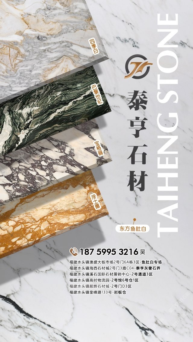 泉州泰亨石材有限公司,辦公地點(diǎn)位于中國(guó)石材之都—南安水頭。經(jīng)營(yíng)產(chǎn)品有:東方魚肚白(自有礦山),四季白,巴黎世紀(jì),寶格麗,浮士德,布達(dá)拉灰(自有礦山),星空灰(自有礦山)、雅蘭云天(包礦)、蘋果灰(包礦)、銀鉆咖啡(包礦)、魚肚白、雪花白、藍(lán)金沙白金沙系列、帕斯高灰、意大利木紋、意大利,西班牙原裝進(jìn)口巖板(中國(guó)總代理)、國(guó)產(chǎn)巖板(福建總代理)、黃斑石、意大利木紋、銀鉆咖啡,魚肚灰等優(yōu)質(zhì)品種。我們以經(jīng)驗(yàn)豐富的采購(gòu)團(tuán)隊(duì),熱情專業(yè)的銷售團(tuán)隊(duì)和執(zhí)著細(xì)致的技術(shù)團(tuán)隊(duì),為客戶提供精致的產(chǎn)品,售前售后服務(wù)和技術(shù)支持。本著為客戶負(fù)責(zé)的態(tài)度,經(jīng)過多年的潛心經(jīng)營(yíng),泰亨石材在石材業(yè)界樹立了良好的信譽(yù)。如果您對(duì)我司的產(chǎn)品服務(wù)有興趣,歡迎在線留言或來電來函咨詢,泰亨石材在追求美的路上與您一路同行。