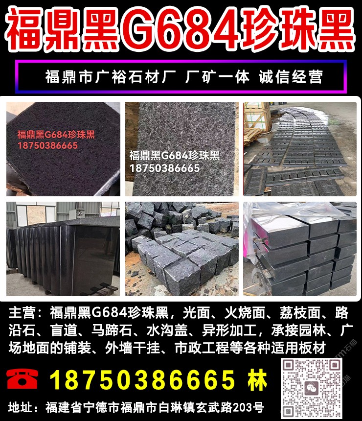 廣裕石材福鼎黑 廠家直銷·質(zhì)量保證 主營:福鼎黑G684、珍珠黑、芝麻黑G654,光面、荔枝面、火燒面、馬蹄石、盲道等。異型加工,承接經(jīng)營:市政園林,廣場地鋪,外墻干掛等各類適用板材 聯(lián)系電話:18750386665林 地址:福建省寧德市福鼎市白琳鎮(zhèn)玄武路203號