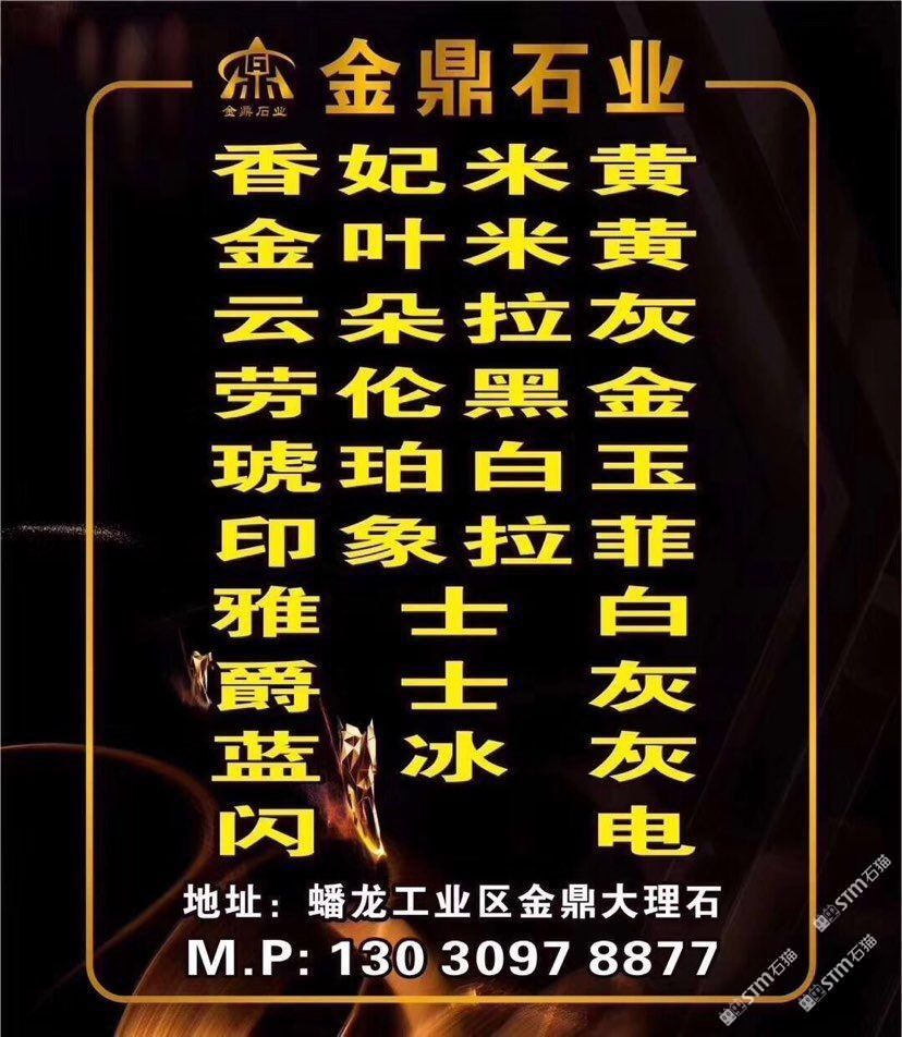 金鼎石業(yè)主營(yíng):香妃米黃,金葉,奧特曼,雅士白,云朵拉灰,白玉蘭,閃電灰,奢石,魚肚灰,波斯灰