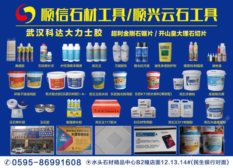 南安市順信石材工具有限公司成立于1999年,位于有“中國石材城”之稱的福建省南安市水頭鎮(zhèn)閩南建材市場內(nèi),分設(shè)石材工具護(hù)理部、干掛部兩個(gè)門市部,是一家批發(fā)、零售兼營的石材配套工具。多年來,憑借產(chǎn)品的齊全、質(zhì)量的保證、信譽(yù)的可靠、服務(wù)的周到,本商行在國內(nèi)同行中已形成自己的地位和影響,并擁有龐大的客戶群體,產(chǎn)品銷至國內(nèi)各大石材生產(chǎn)基地。我們代理的品牌有:武漢科達(dá)大力士膠、環(huán)氧膠、化學(xué)錨栓、干掛膠、植筋膠等產(chǎn)品系列;亮石王防護(hù)劑、防古水、水晶膠、樹脂膠、友豐比利蠟等產(chǎn)品;粵邦消紋劑、染色劑、百亮鋼絲棉、百潔墊;旗魚、非爾、柏興、順輝、背栓螺絲;各種款式干掛件、幕墻材料輔助產(chǎn)品;磨料磨具品牌有益和、超利、順興、閩福、芒果、金山、金鋒、智輝等;進(jìn)口、國產(chǎn)防古刷、亞光磨料、大理石磨料;意大利開山皇大理石刀具、微晶石刀具、電鍍切片、超利金鋼石切割片、軟磨片、翻新片、金鋼盤、樹脂盤;大小規(guī)格刀具、鉆頭、雕刻工具齊全;金鋼石異形輪、石材夾具、吊具、吊繩、勞保用品;電動(dòng)工具、氣動(dòng)工具、銅條、鋼條、合金工具等各種各樣產(chǎn)品齊全。