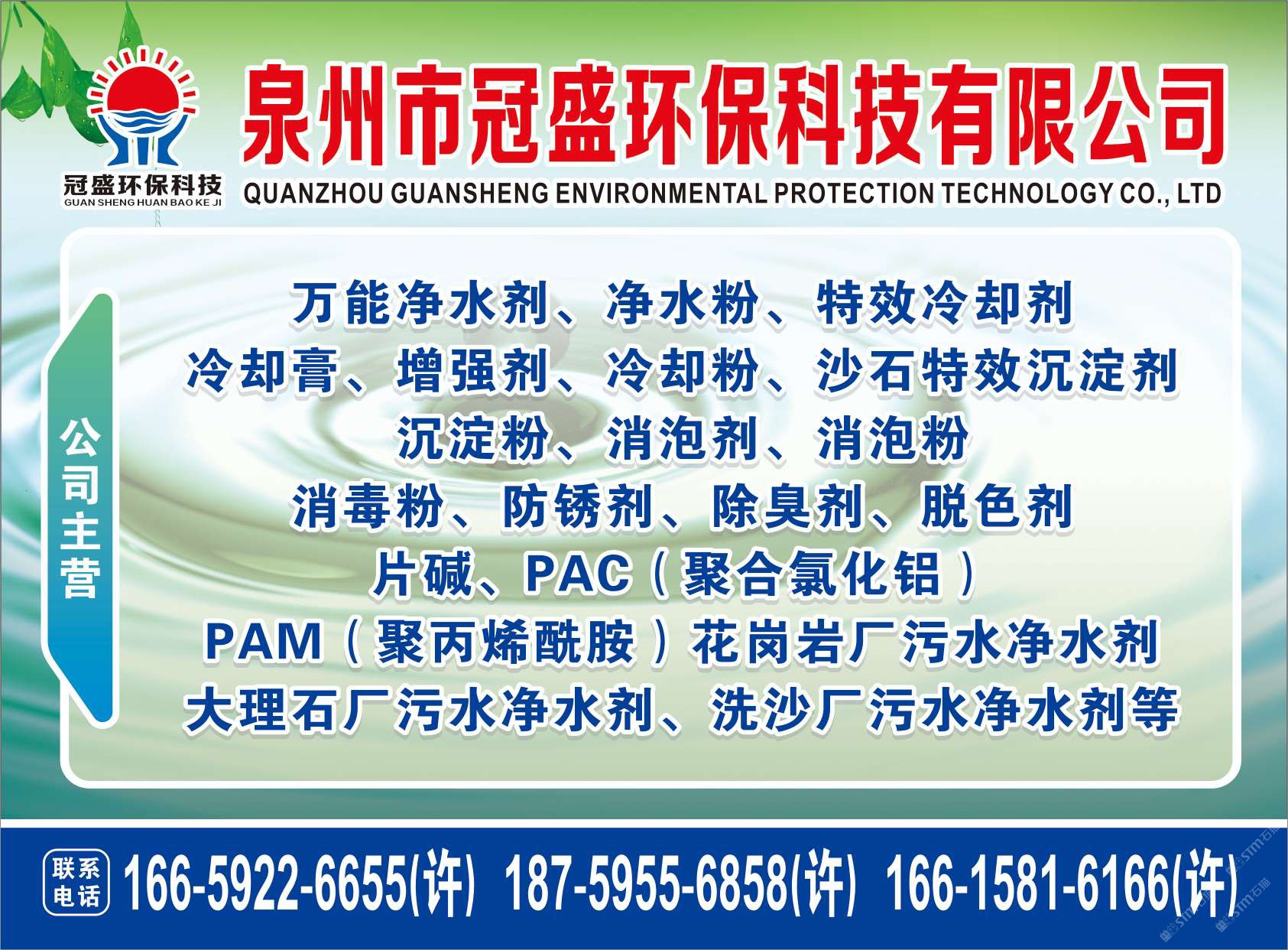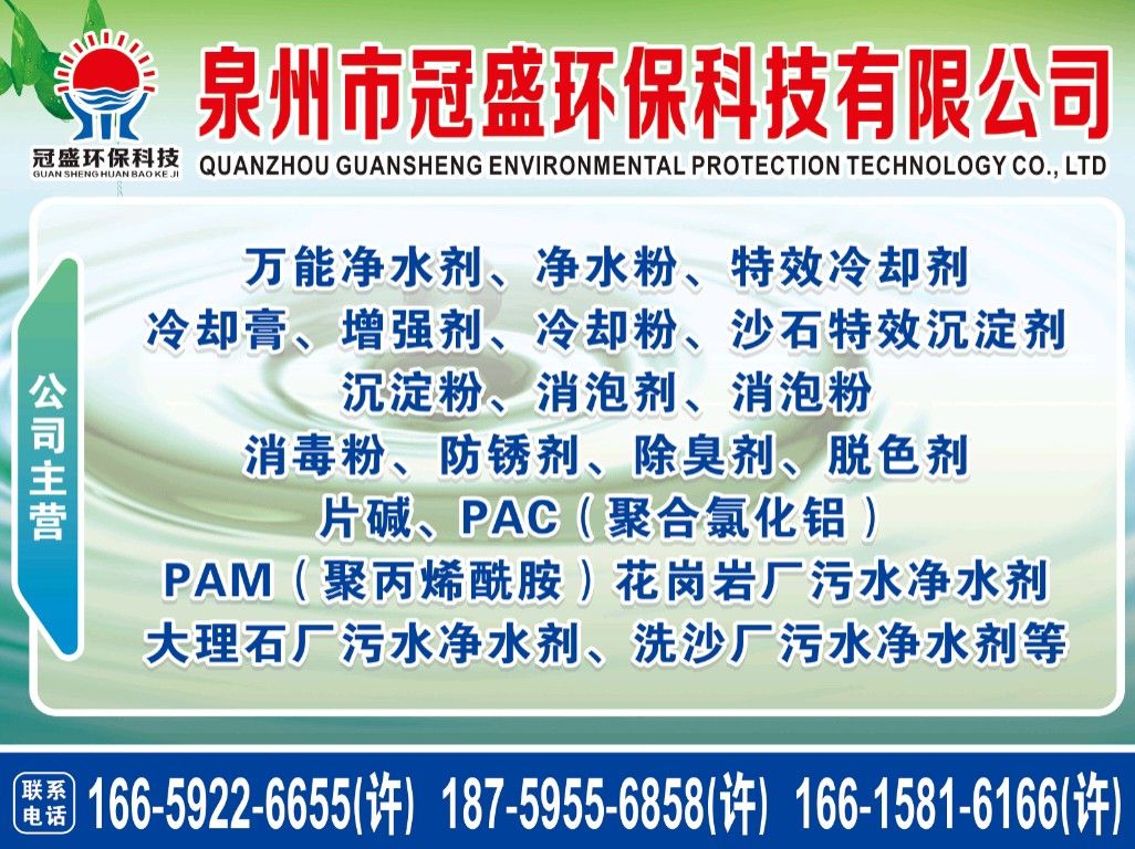 主營產(chǎn)品:凈水劑,冷卻劑,冷卻粉,大理石人造石專用凈水劑,沉淀粉,消泡劑,消毒凈水劑,防銹凈水劑,除銹劑,除臭劑,聚丙烯酰胺,聚合氯化鋁,鹵精,洗沙專用凈水劑,壓濾機(jī)專用凈水劑,陶瓷廠專用凈水劑(黃藥 白藥)等所有水處理環(huán)保材料……