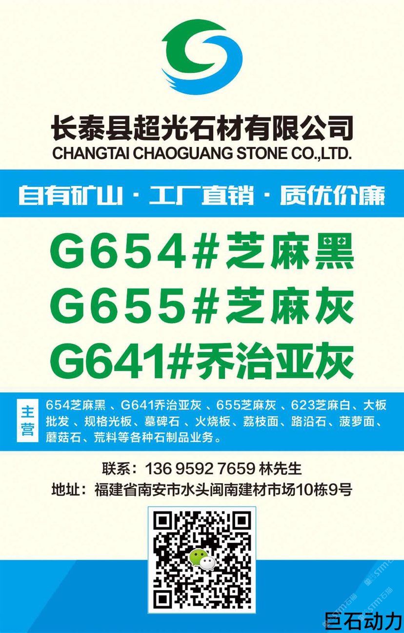 超光石材主營(yíng):654芝麻黑 、G641喬治亞灰 、655芝麻灰 、623芝麻白,大板批發(fā) 、規(guī)格光板、墓碑石 、火燒板、荔枝面、路沿石、菠蘿面、蘑菇石、荒料等各種石制品業(yè)務(wù)