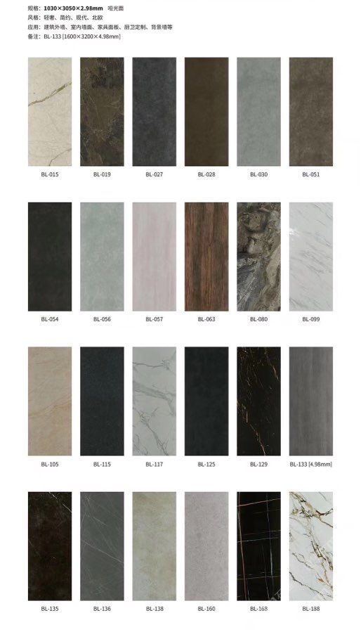 發(fā)布信息: ????SIBELAN 斯貝納巖板???? ????意大利設(shè)計師精選巖板???? 我們可以幫老總您加工為成品, 全國范圍內(nèi)可安排專業(yè)團隊安裝. 做到您一次性采購 省心. 放心. 省時. 低價! 巖板紋路版面全多達199 款 勵志做服務(wù)五星的巖板專業(yè)供應(yīng)商 魚肚白 雪花白 格蘭云天 寒江雪 爵士白 幻影灰 勞倫黑金 火山灰 亞馬遜 艾維拉 羅馬黑檀 貝特巖 細花白 羅馬灰 云朵拉灰 魚肚金 莎羅娜 莎羅蘭 勞倫白金 拉薩白 中花白 灰冰玉 卡拉拉白 撒金黑 清水玉 薩瓦灰 莎士比亞 大花灰 白冰玉 銀灰洞 阿瑪尼灰 綠紋玉 綠冰玉 藍紋玉 保加利亞灰 鐵銹 黑木紋 流砂灰 純白 純灰 純黑 TEL: 15905069590 聶 各種版面規(guī)格全部如下: 1200×600×11mm 啞光 1500×800×11mm 啞光 1800×900×11mm 啞光 1800×900×12mm 啞光 2600×800×15mm 啞光 2400×1200×6mm 啞光/亮光 2400×1200×9mm 啞光/亮光 2400×1200×15mm 啞光 2700×1200×6mm 啞光/亮光 2700×1600×12mm 啞光/亮光 3200×1600×6mm 啞光/亮光 3200×1600×12mm 啞光/亮光