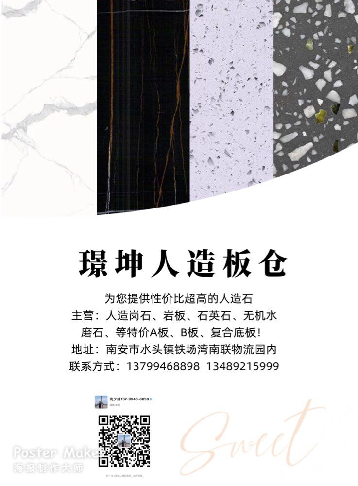 發(fā)布信息: ~璟坤人造板倉(cāng)~特價(jià)人造石 主營(yíng):人造崗石、石英石、巖板、無(wú)機(jī)水磨石 現(xiàn)推出特價(jià)優(yōu)惠的人造板 特價(jià)A板、B板、復(fù)合底板專(zhuān)用 聯(lián)系電話(huà):13799468898高先生 地址:南安市水頭鎮(zhèn)鐵場(chǎng)灣南聯(lián)停車(chē)場(chǎng)內(nèi)(華置石業(yè)斜對(duì)面) #璟坤人造板倉(cāng)# #璟坤石業(yè)專(zhuān)注:別墅,會(huì)所,酒店等室內(nèi)外精裝石材#