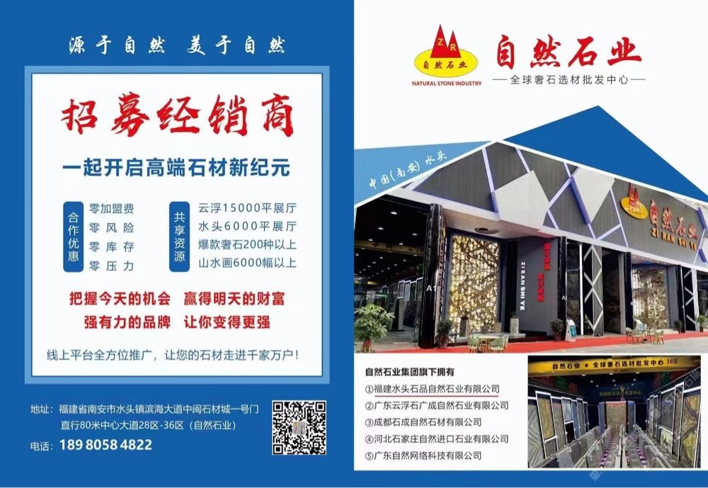 發(fā)布信息: 自然石業(yè)全球奢石批發(fā)中心,招募經(jīng)銷商,無需加盟費(fèi),一手貨源,專業(yè)背景墻供應(yīng)廠家。歡迎選購(gòu) ??19305059488(微信同號(hào)) 主營(yíng):潘多拉,新款潘多拉,藍(lán)絲綢,紅絲綢,絲綢之路,魅力人生,蒂芙尼,卡拉白,魚肚白,魚肚灰,盛世紅顏,紅寶石,石榴紅寶,桃李春風(fēng),金枝玉葉。金玉滿堂,金孔雀,孔雀開屏,火樹銀花,潘多拉,維也納,亞馬遜綠,綠翡翠,加雅綠,白色羅馬,藍(lán)色羅馬,羅馬印象,海納百川,春山畫境,冰河世紀(jì),波光靈動(dòng),金戈壁玉,天澤玉石,鉑金鉆,翰墨白金,景泰藍(lán),皇家藍(lán),白銀狐,雪山銀狐,雪山蘭,雪山藍(lán),雪山白,山水畫,煙影流香,藍(lán)水晶,紫水晶,加爾達(dá)之晶,龍文綠,竹節(jié)綠,綠斑竹,紫氣東來,千里馬,藍(lán)色精靈,壁山芳華,格蘭云天,香格里拉,夢(mèng)幻藍(lán)寶,海洋之星,綠野仙蹤,藍(lán)翡翠,自然白,羅馬灰,白底潘多拉等產(chǎn)品!有單你來談,價(jià)格好商量! 中閩石材城28區(qū)-36區(qū)(一號(hào)門直走一百米左手邊)