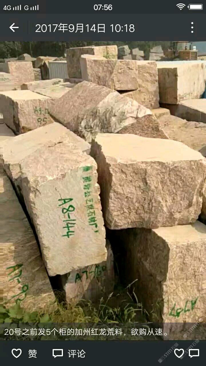 發(fā)布信息: 加州紅龍全球供應(yīng)商,雪浪石,小米黃,黑白山水石。電話13960213938微信同號(hào)。地址,水頭建材市場(chǎng)32棟15號(hào)。海西建材市場(chǎng)11棟10號(hào)。水頭工廠地址,建材市場(chǎng)對(duì)過,銘亮石材廠?;牧希N骰牧鲜袌?chǎng)2號(hào)倉1號(hào)吊下邊。廠址河北省石家莊市靈壽縣東木佛橋北100米路西。河北荒料,石家莊市靈壽縣南紀(jì)城港源物流。