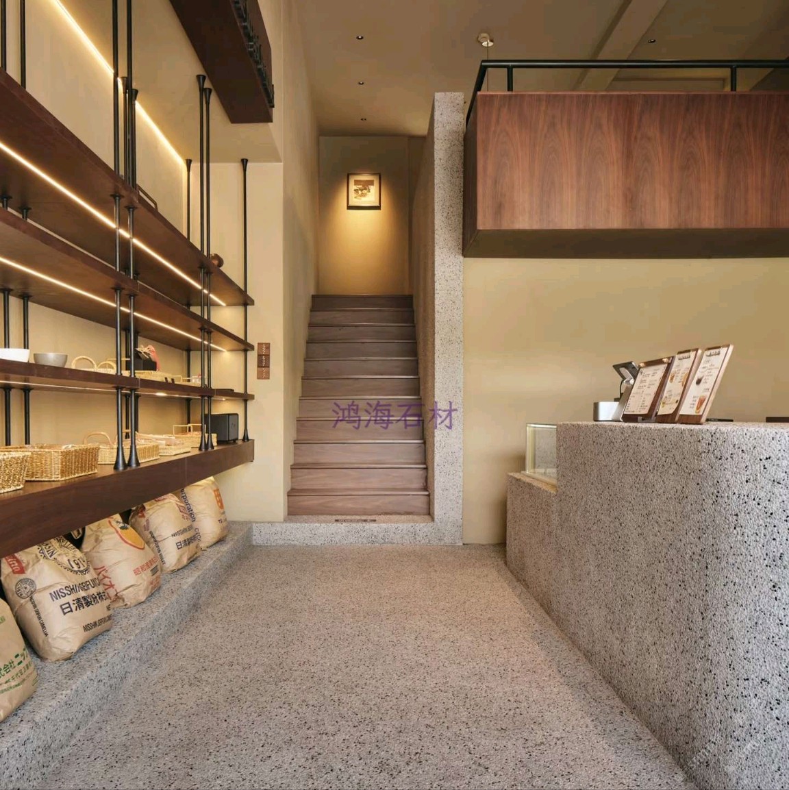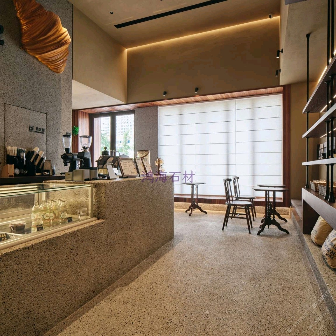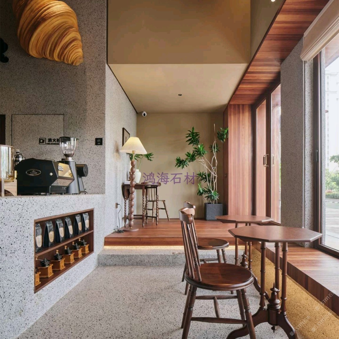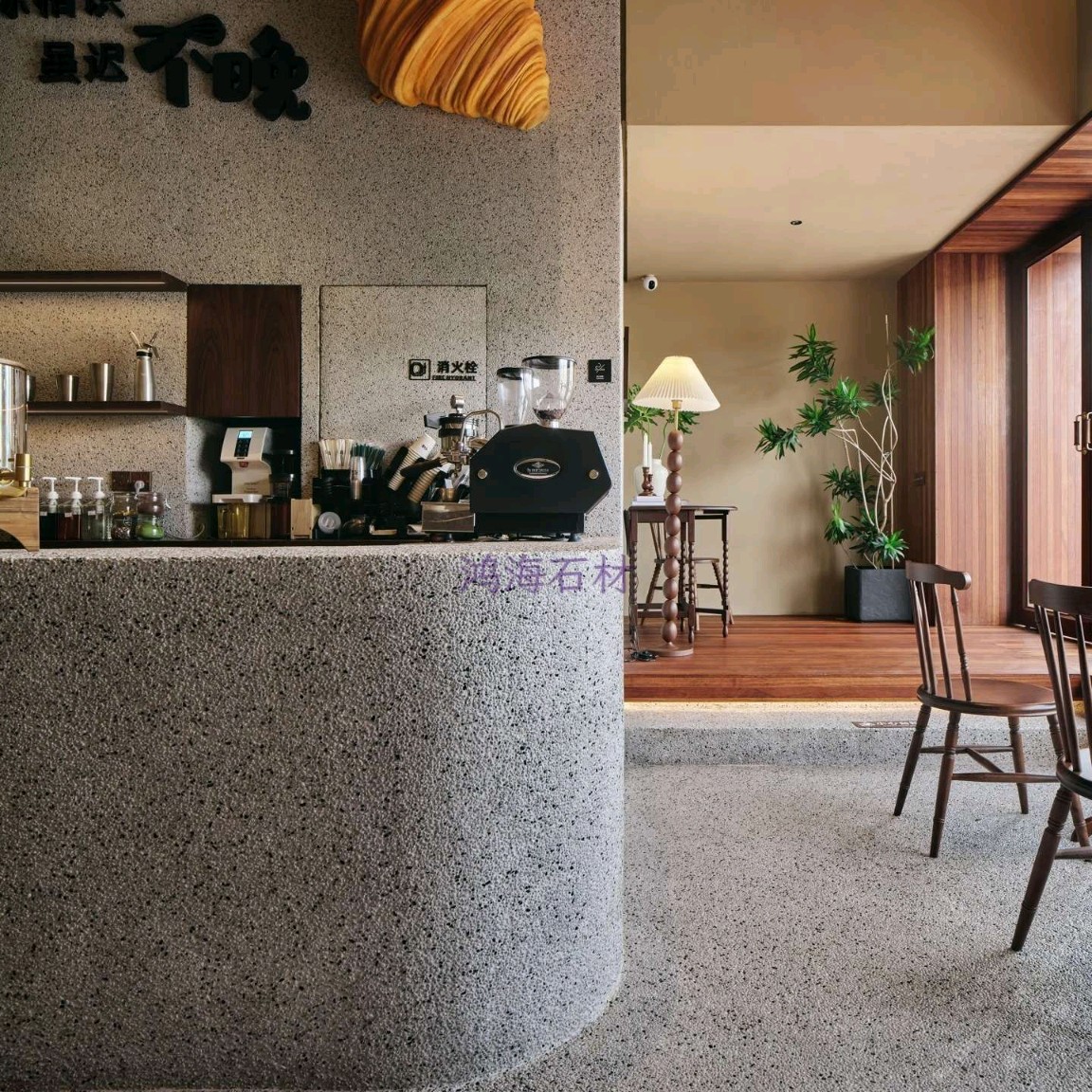 發(fā)布信息: 咖啡店設(shè)計(jì)干貨|水磨石 木格柵的組合 一進(jìn)門(mén)就被水磨石打造的吧臺(tái)狠狠洗衣,顆粒感的肌理搭配溫潤(rùn)的木質(zhì)吊柜,觸感和視覺(jué)的碰撞真的太妙了~ 墻面的“與你相識(shí)雖不晚”直接戳中內(nèi)心,旁邊的巨型可頌裝置既是裝飾又點(diǎn)明了品類(lèi),細(xì)節(jié)感拉滿。 動(dòng)線設(shè)計(jì)也很舒服,點(diǎn)單區(qū)和取餐區(qū)劃分清晰,哪怕人多也不會(huì)覺(jué)得擁擠,把功能性和美學(xué)平衡得恰到好處。