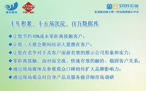 發(fā)布信息: 【2018第九屆重慶石材展5月在渝舉辦!】 主辦:重慶市工商聯(lián)(總商會(huì))建材商會(huì)、重慶建宇展覽有限公司 時(shí)間:2018年5月10-12日 地點(diǎn):重慶國(guó)際會(huì)議展覽中心 【往屆回顧】 上屆展會(huì)有來(lái)自國(guó)內(nèi)外近600余家知名企業(yè)和品牌參展,展示面積25000平方米,共接待了包括開(kāi)發(fā)商、建筑商、承包商、裝飾設(shè)計(jì)、代理商、經(jīng)銷商等專業(yè)人士近3萬(wàn)人次,被業(yè)界譽(yù)為中國(guó)西部地區(qū)專業(yè)性強(qiáng),參展效果的行業(yè)盛會(huì)之一!同時(shí)也得到了重慶市政府部門及行業(yè)主管部門的大力支持和指導(dǎo)。 【參展范圍】 石材類:大理石/花崗石/砂巖荒料、石灰石、板巖等 板材類:天然石材/大理石/花崗石板材、環(huán)境石材 人造石類:人造石英石、人造文化石、人造石板材 石雕制品類:石雕、石刻制品、園林風(fēng)景石、假山石等 環(huán)境裝飾類:卵石、仿古石、景觀石、磨菇石等 石材機(jī)械及加工設(shè)備:金剛石串珠鋸、研磨拋光設(shè)備、水射流切割機(jī)等 養(yǎng)護(hù)材料及設(shè)備:石材養(yǎng)護(hù)用品及設(shè)備、各類石材清洗、研磨劑、石材拋光劑等 【為什么選擇-建宇·建博會(huì)—十年積累、十五屆沉淀、百萬(wàn)數(shù)據(jù)庫(kù)】 ?節(jié)約40%成本零距離接觸客戶 ?三天展會(huì)期間結(jié)識(shí)大量潛在客戶 ?在對(duì)手及客戶面前展示公司形象和實(shí)力 ?快速有效的融洽、穩(wěn)固客戶關(guān)系 ?通過(guò)現(xiàn)場(chǎng)媒體及觀眾口碑相傳擴(kuò)大品牌影響力 ?通過(guò)現(xiàn)場(chǎng)觀眾對(duì)產(chǎn)品及服務(wù)做詳細(xì)市場(chǎng)調(diào)研 【聯(lián)系方式】 單 位: 重慶建宇展覽有限公司 電 話: 023-86376000/62925058 傳 真: 023-86376218 e-mail: jianyuzl@163.com 地 址: 重慶市南岸區(qū)南坪西路3號(hào)商業(yè)大樓29-4